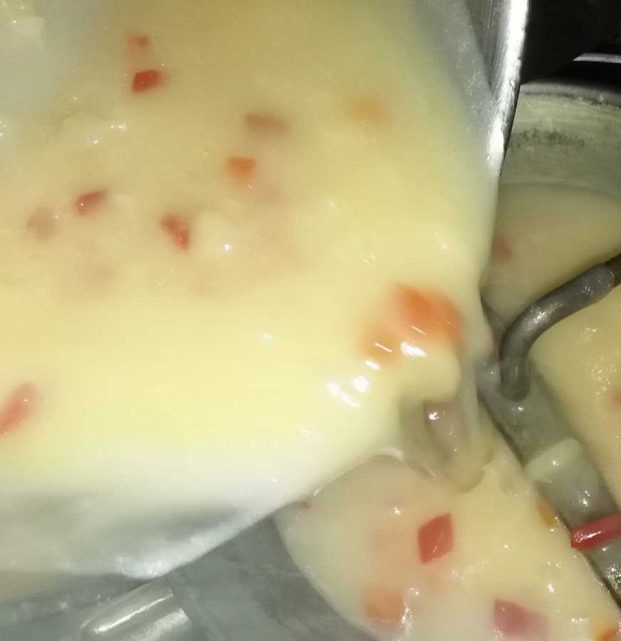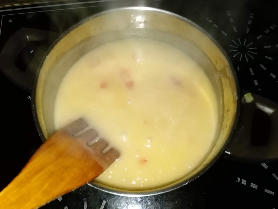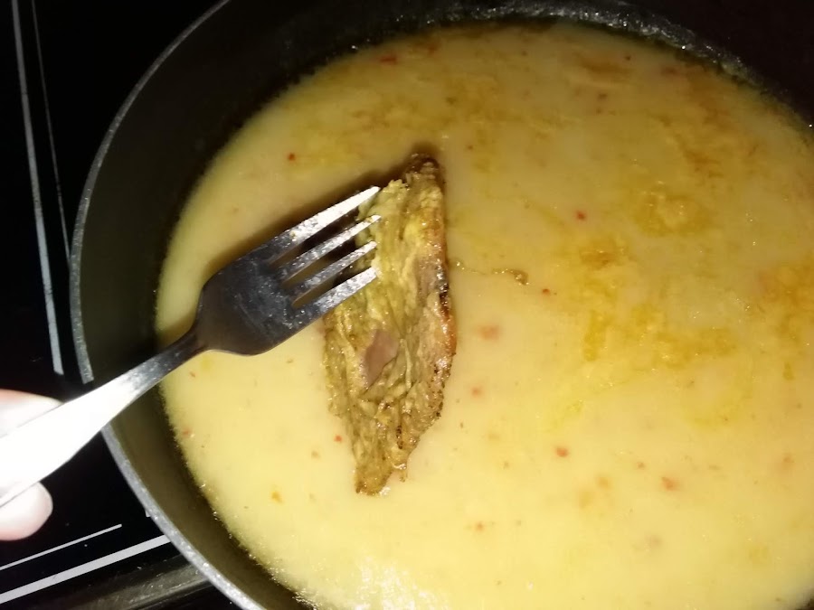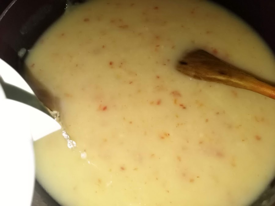 Ponemos la salsa que teníamos hecha a calentar, si ha quedado espesa añadimos agua hervida y comprobamos sal