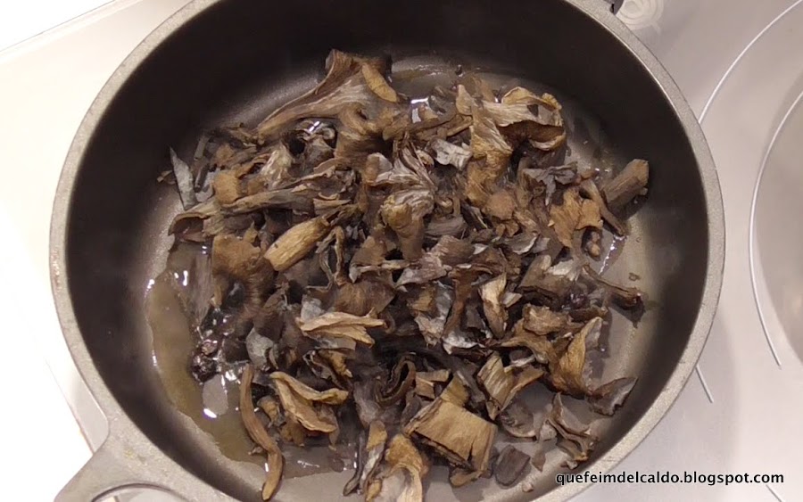 Cuando esté a punto de cumplirse la hora y media de cocción del pavo ponemos en una sartén un poquito de aceite y salteamos las trompetas de la muerte que tienen que estar limpias.