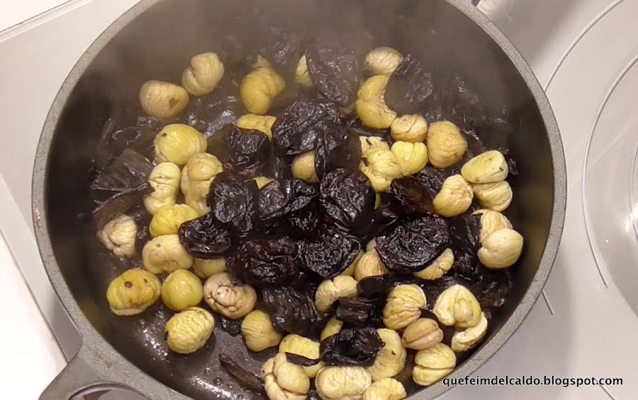 Finalmente añadimos las ciruelas secas, dejamos salteando un par de minutos e incorporamos a la cazuela.