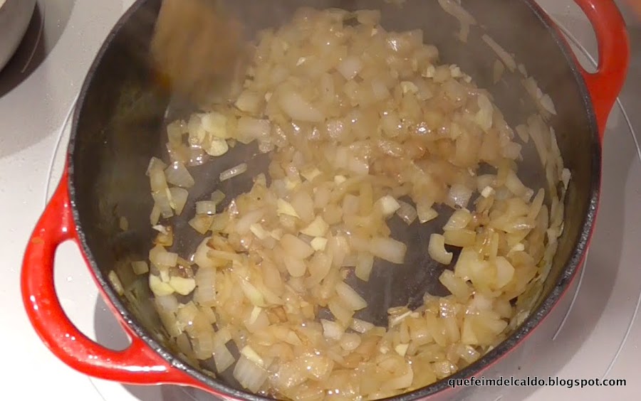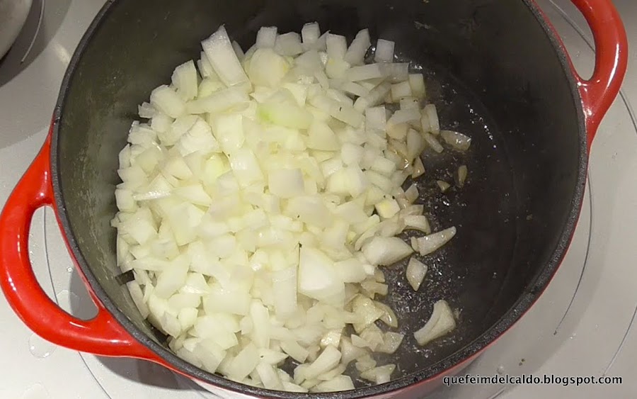 Ponemos en una cazuela de hierro fundido la cebolla picada, la dejamos a fuego lento pochandose durante 6 minutos.