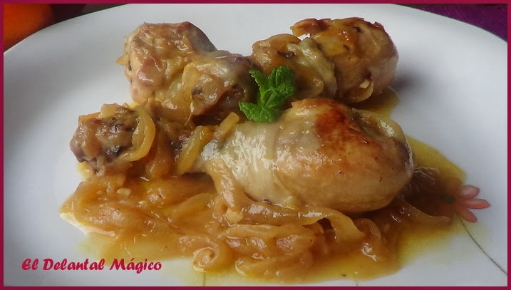 Dejamos que se evapore el alcohol y añadimos la ralladura y el zumo de naranja. Dejamos cocer unos 30 minutos, y listo. Servimos los jamoncitos cubriéndolos con la salsa, vereis que el pollo queda muy tierno y la salsa con la cebolla está estupenda.
