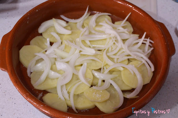 Cortamos las patatas en rodajas no muy finas y la cebolla en tiras. Lo ponemos todo en la cazuela de barro con un pelín de aceite.Sazonamos con sal y pimienta.