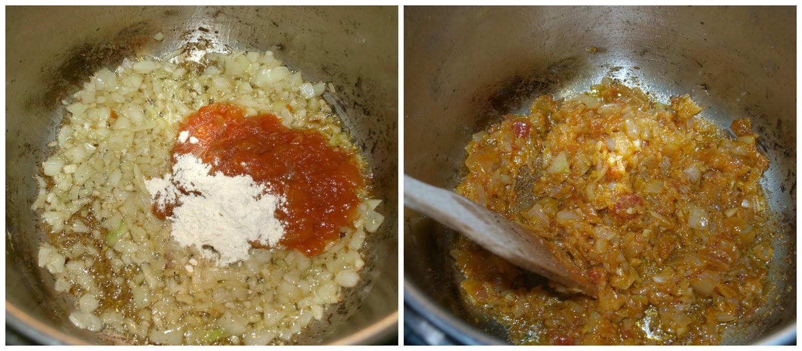 - Cuando estén tiernos añadimos la salsa de tomate y a harina, y mezclamos bien.
