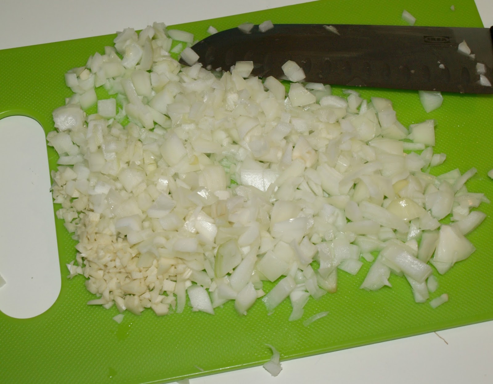 - En la misma olla, ponemos a dorar cebolla y ajos picados.