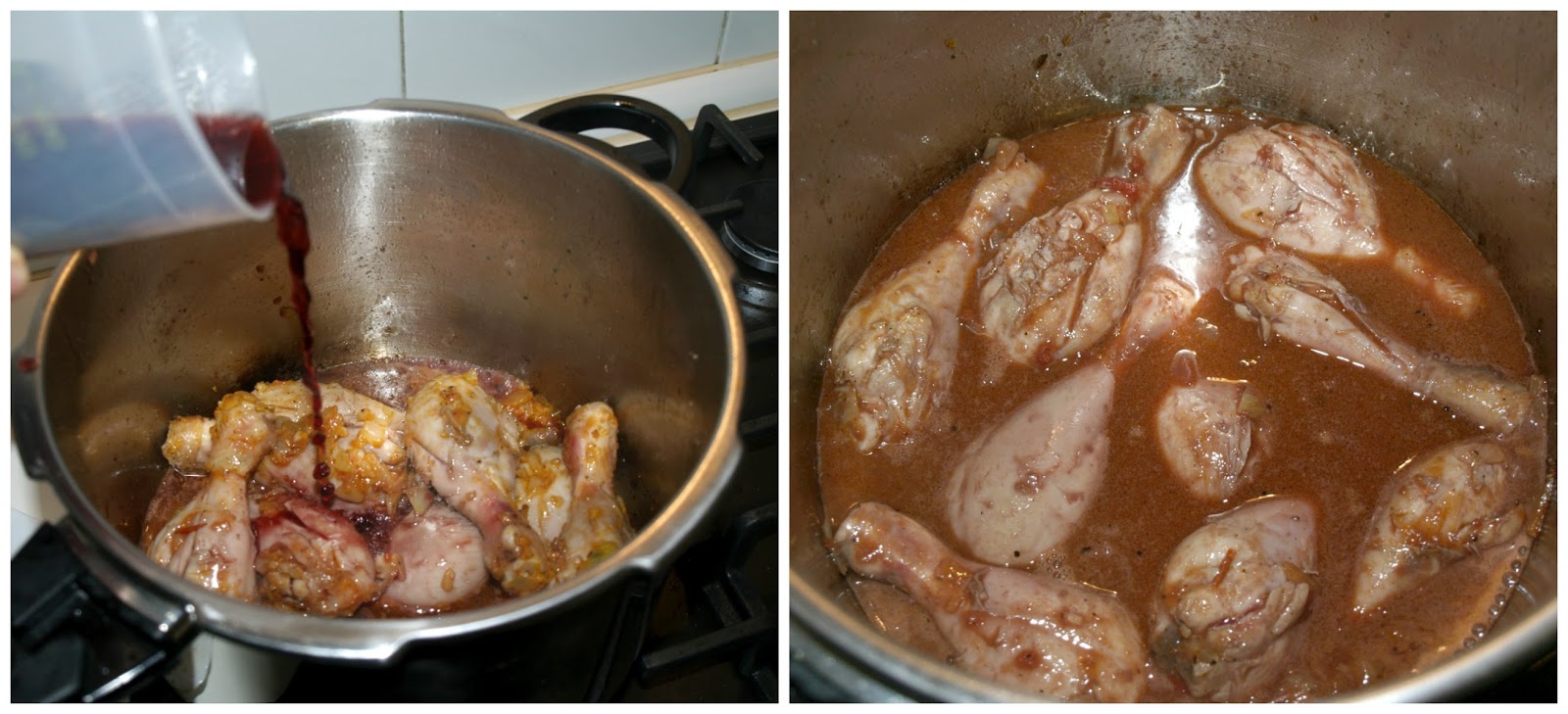 - Por último echamos el vino, que casi cubra todo. Cuando empiece a hervir cerramos la olla, y cuando la válvula empiece a echar vapor y dar vueltas bajamos el fuego y contamos 10 minutos en la olla rápida o 20 en la tradicional.