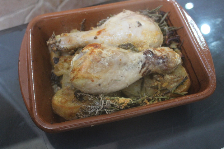 Unos deliciosos jamoncitos de pollo al horno, acompañados de unas patatas confitadas en la freidora, aromatizados con unas ramitas de romero fresco.