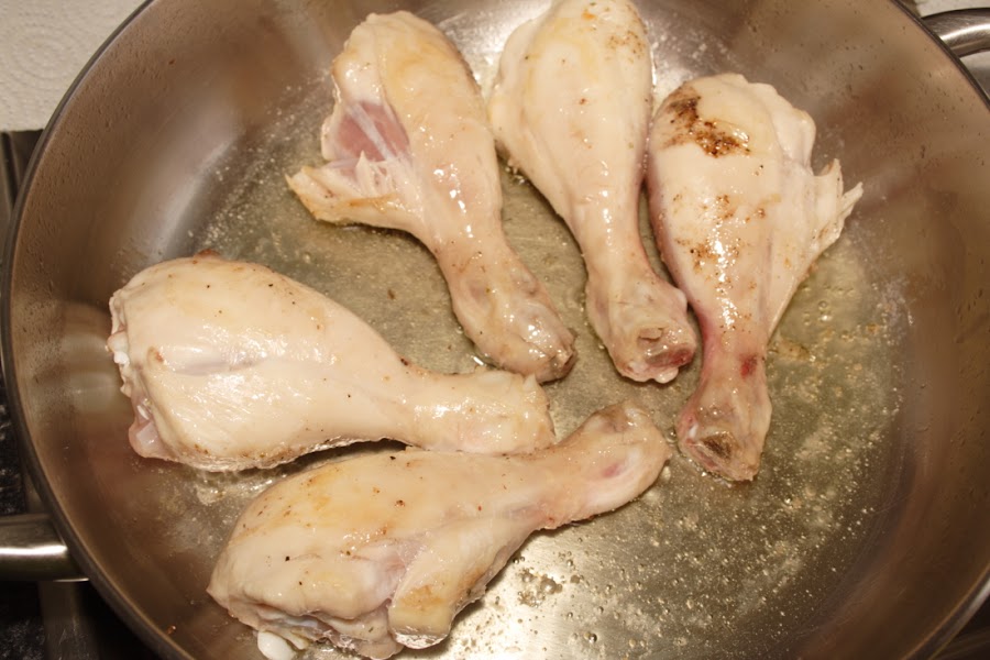 Limpiamos y pelamos los jamoncitos de pollo. Salpimentamos y los ponemos a dorar en una olla baja y ancha con aceite de oliva. Cuando se doren por todas las caras, los sacamos y reservamos.