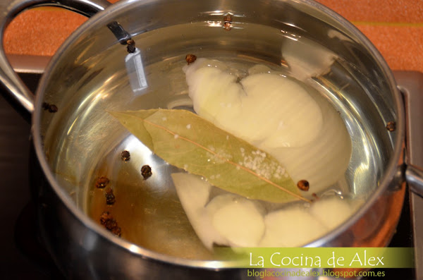 PREPARACIÓN:Lo primero que preparamos es el caldo para que se vaya haciendo, en una cazuela con agua ponemos una hoja de laurel, la primera capa exterior de la cebolla, unos granos de pimienta y un poco de sal. Lo dejamos hervir a fuego medio-bajo mientras hacemos el resto de la preparación.