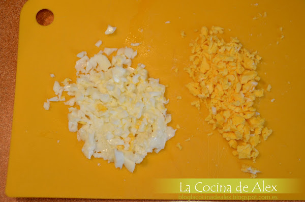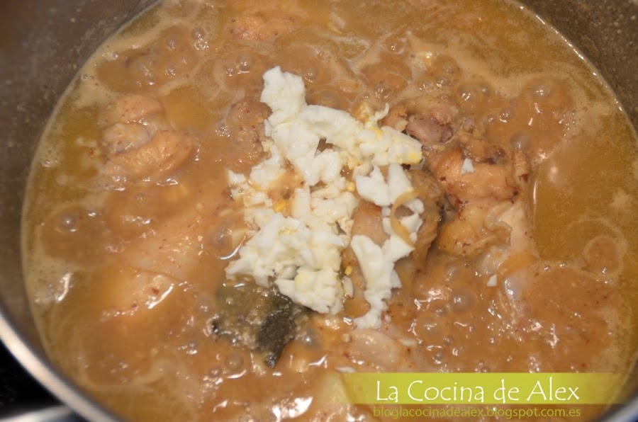 Cocemos el huevo, separamos la clara de la yema y las picamos. A mitad de la cocción anterior, cuando lleve unos 15 minutos le añadimos la clara a la cocción, removemos y dejamos que pase el resto del tiempo hasta que el pollo este tierno y el caldo haya reducido y espesado.