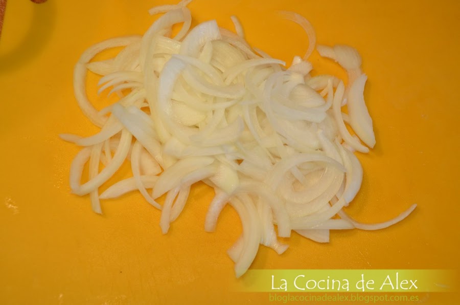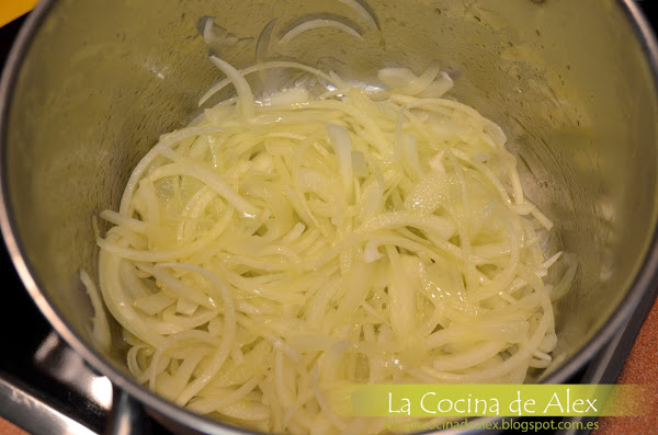 A continuación picamos la cebolla en juliana y la ponemos a pochar a fuego medio en una cazuela grande, es importante que no se dore para que lego no de color a la salsa final.