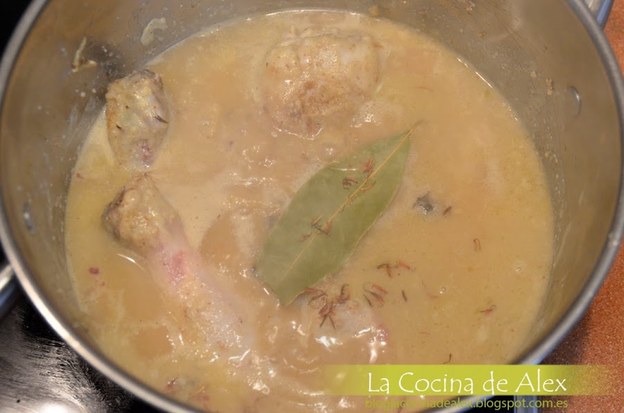 A continuación añadimos a la cazuela una hoja de laurel, el azafrán del paso anterior y cubrimos con el caldo que hemos estado haciendo desde el principio. Dejamos cocinar a fuego medio-bajo durante 20-30 minutos.