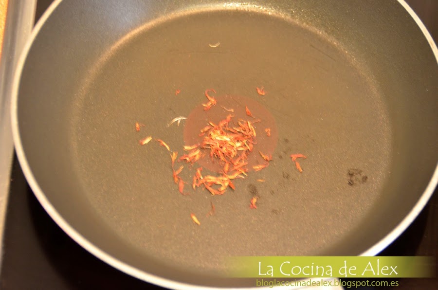 Lo siguiente que hacemos es poner las hebras de azafrán en una sarten a fuego medio (sin aceite) y tostamos para sacar todo el sabor del azafrán.