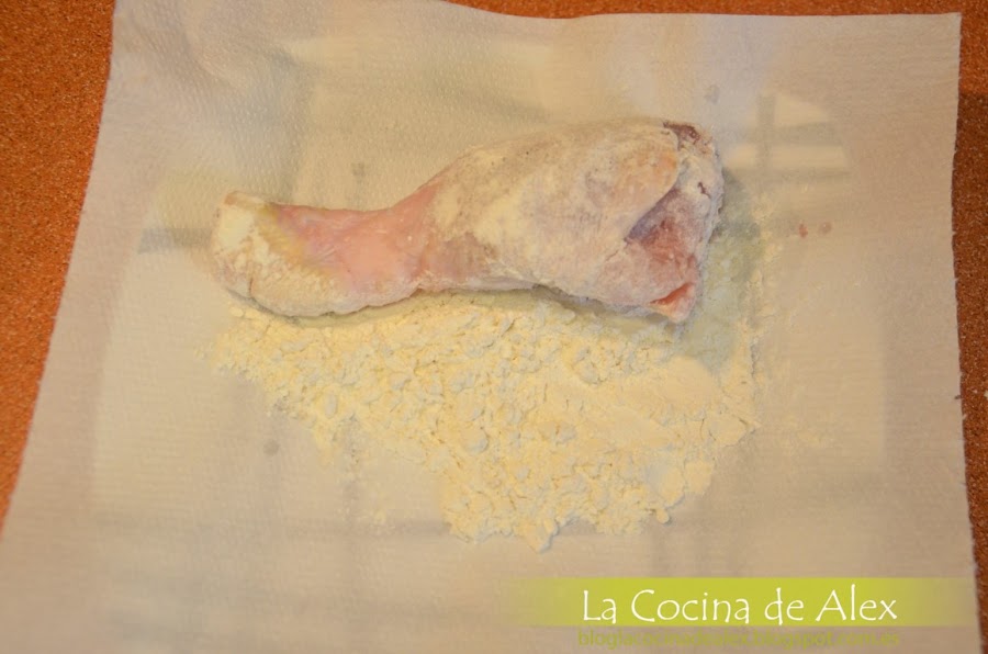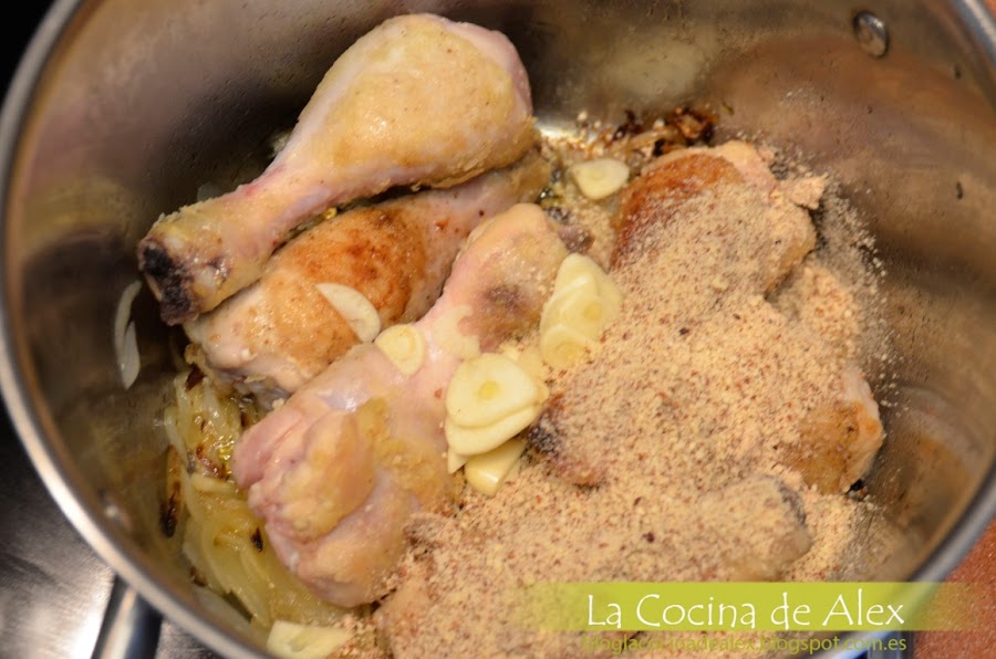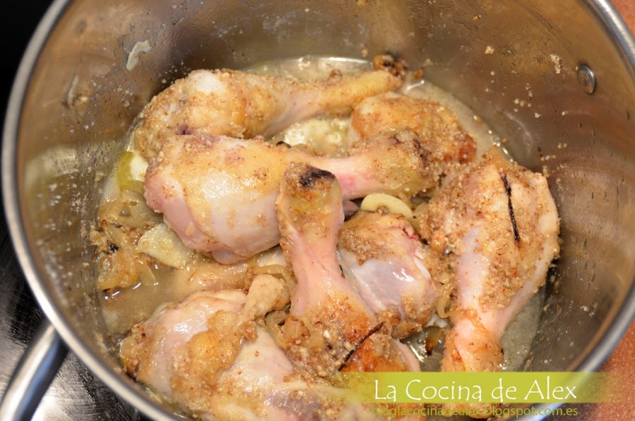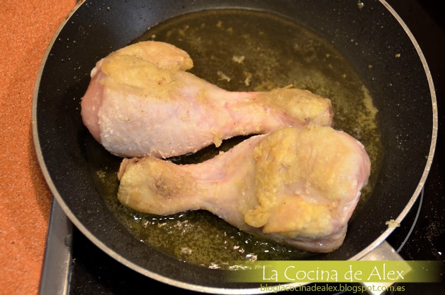 Pasamos los jamoncitos de pollo por harina, los doramos en una sarten con un poco de aceite y los incorporamos a la cazuela cuando la cebolla este bien pochada.