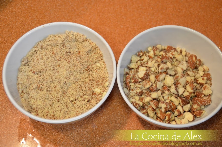 Ahora cortamos los dos dientes de ajo en laminas. Separamos las almendras en dos partes, una mitad la picamos en trozos pequeños y la otra mitad la molemos hasta obtener un polvo de harina lo mas fino posible (si usamos almendras ya peladas el resultado final de salsa sera mucho mas blanca), podemos comprar tanto la almendra molida con troceada y nos ahorraríamos este paso. Añadimos tanto el ajo como la almendra molida a la cazuela y cocinamos unos minutos para que se liguen todos los sabores.