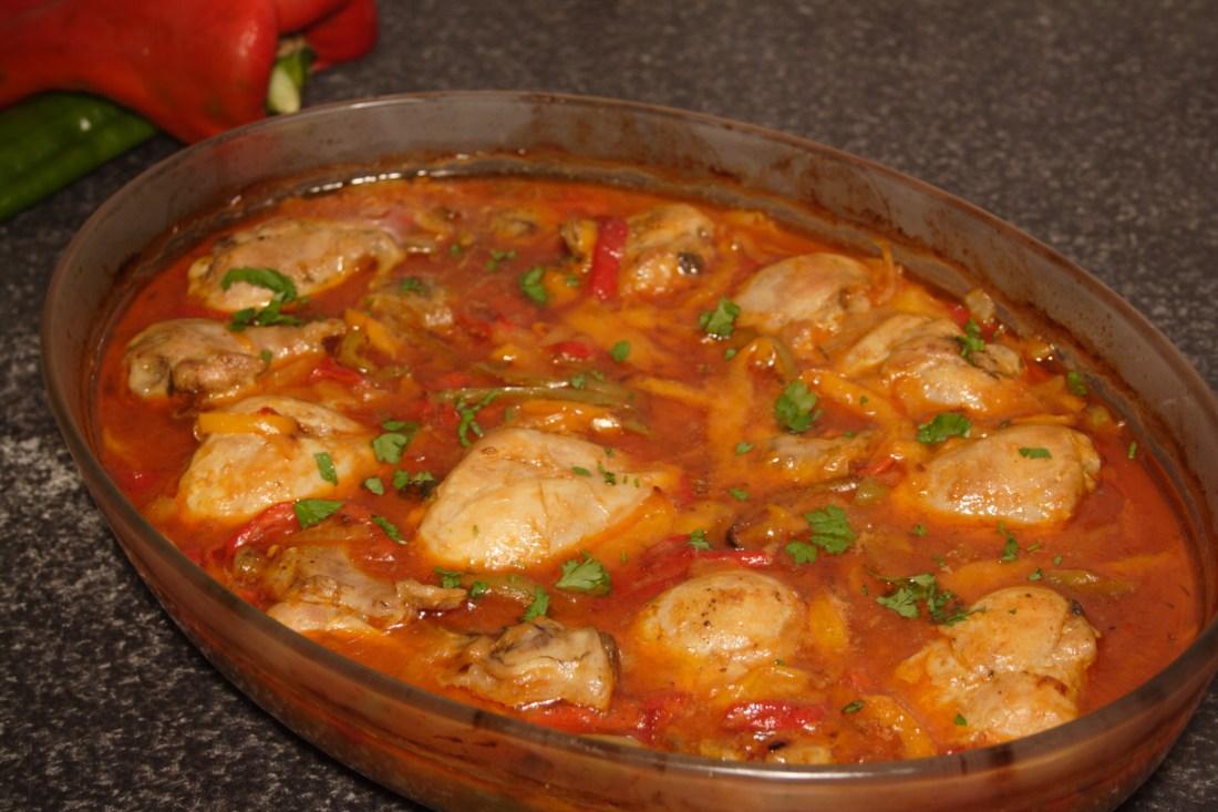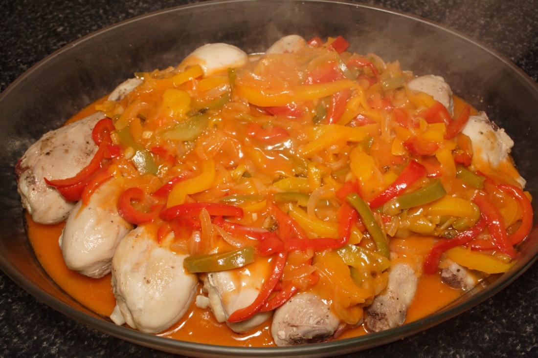 Vertemos todo ello sobre el pollo reservado en la fuente de horno, cubrimos con caldo si no es suficiente la salsa y horneamos a 200ºC, calor arriba y abajo durante 55 minutos y bajamos la temperatura a 180ºC cuando el líquido esté hirviendo.