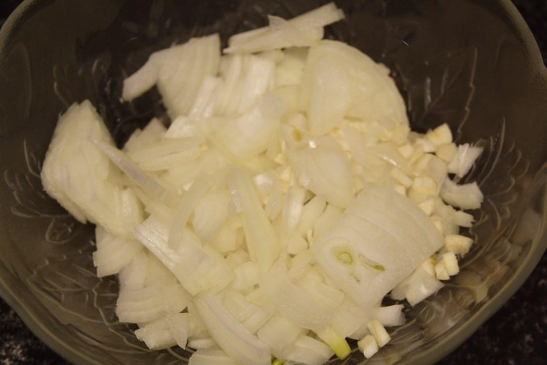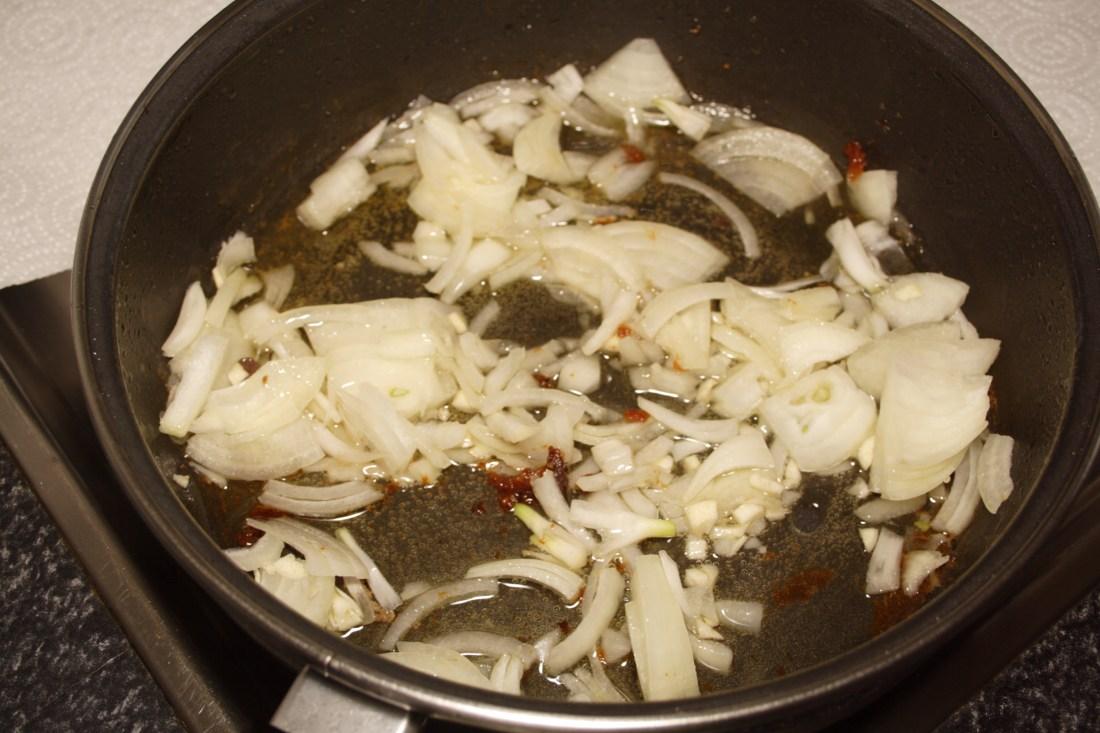 En la misma cazuela y aceite echamos la cebolla, el ajo y pochamos unos 5 minutos.