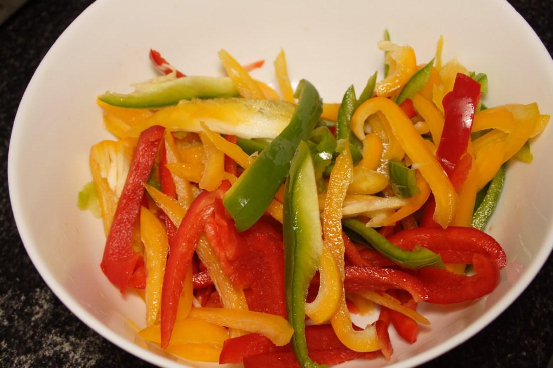 Cortamos la cebolla finamente, los pimientos en tiras finas, el ajo menudo y reservamos.