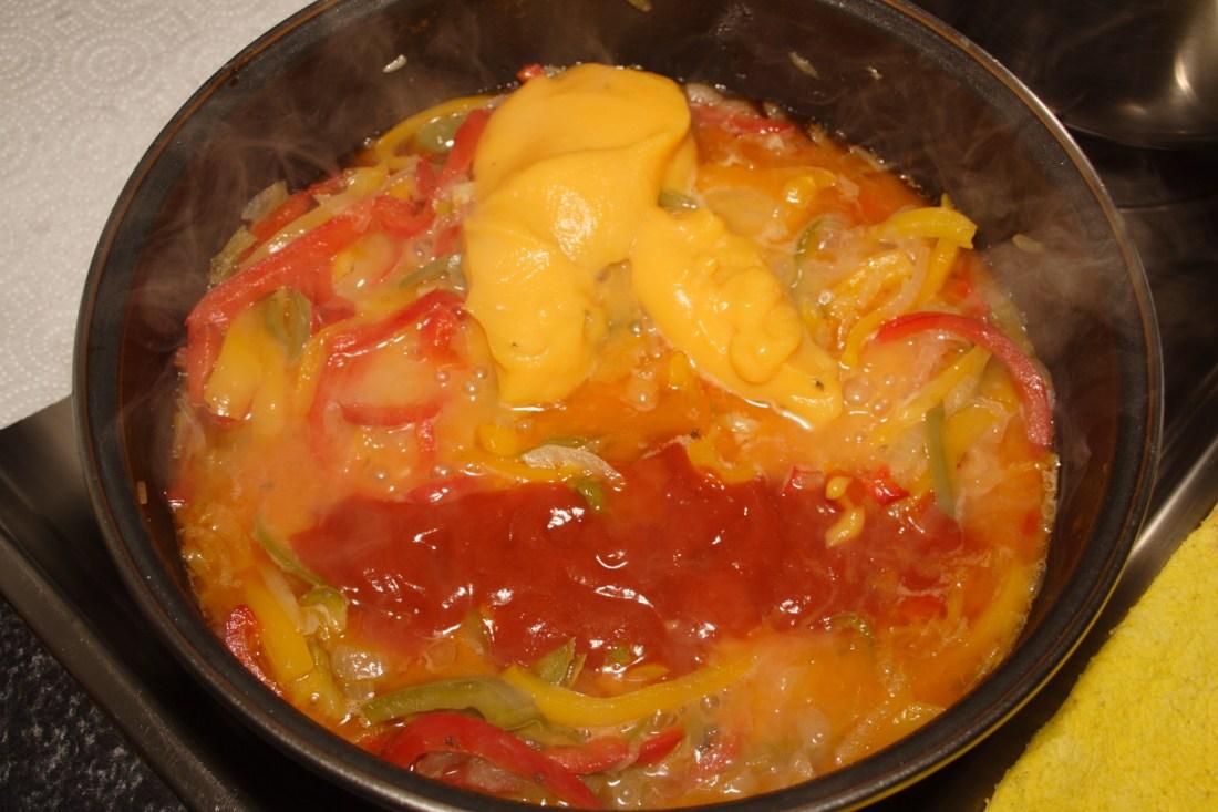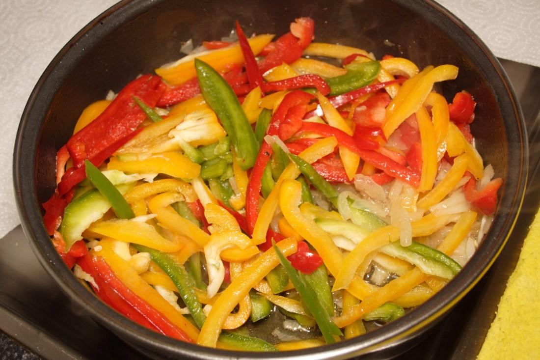 Incorporamos los pimientos, salpimentamos a gusto, removemos y dejamos cocinar a fuego medio hasta que los pimientos estén tiernos.