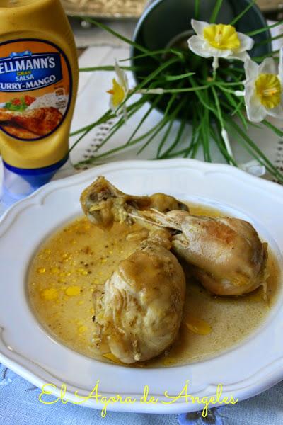 En esta ocasión los ingredientes estrella en mi casa han sido las salsas Hellmann`s,tanto la DeLuxe como la de curry-mango y , precisamente, me decidí por esta última para elaborar la receta:curry y pollo juntos nunca fallan.