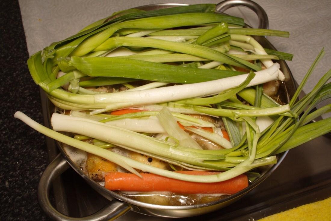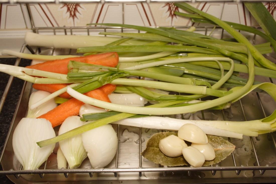 Lavamos bien y pelamos las verduras, cortamos las zanahorias en cuartos a lo largo, las cebolletas en dos y reservamos.