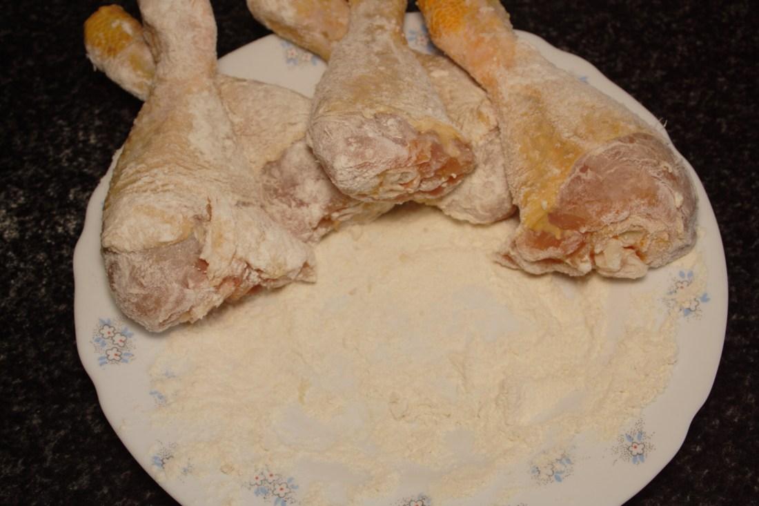 Sazonamos los jamoncitos de pollo, rebozamos en harina.