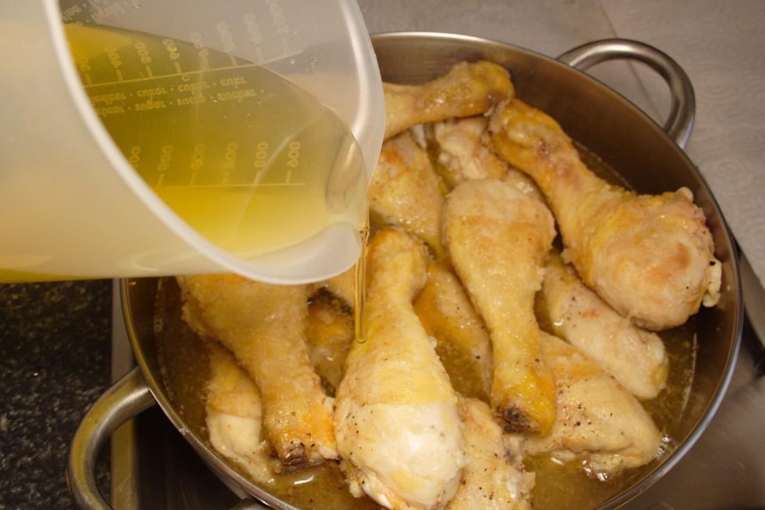 Removemos, tapamos y dejamos cocer a fuego lento hasta que el pollo esté blando, vamos removiendo de cuando en cuando y rectificamos de sal. Si lo hacemos en olla exprés, seguimos todos los pasos, tapamos la olla, cuando empiece el vapor dejaremos cocer 25 minutos y la abriremos una vez fría.