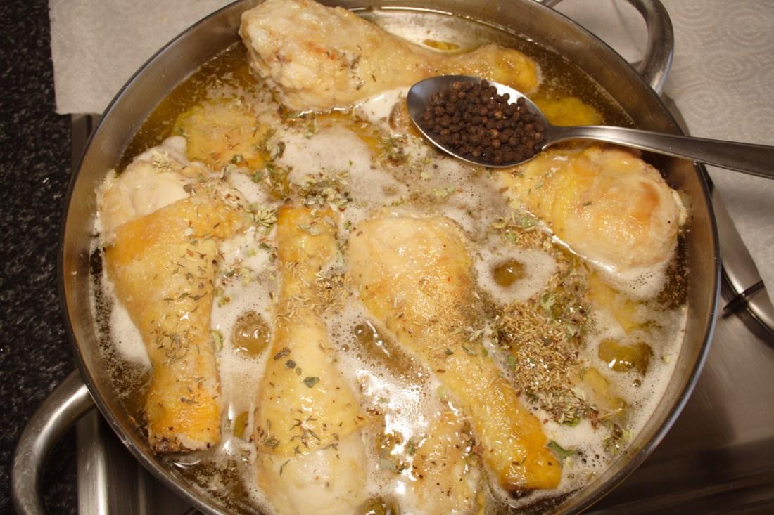 Una vez dorados por todas sus caras los pasamos a la misma cazuela y los rehogamos con el vino, el vinagre y el aceite. Espolvoreamos con las hiervas aromáticas y echamos la pimienta negra.