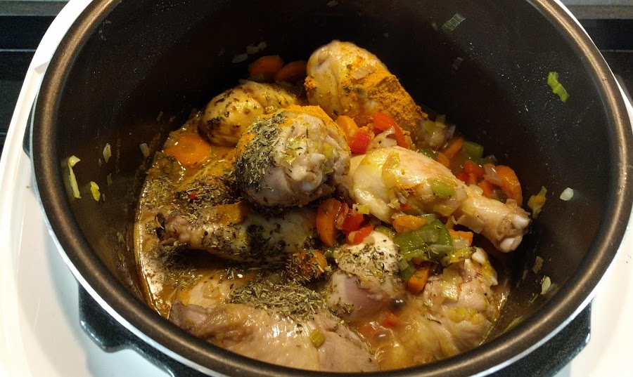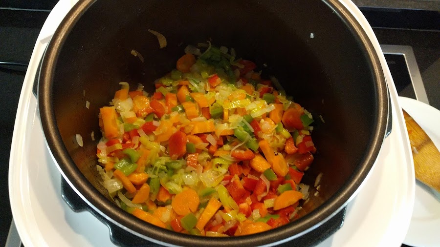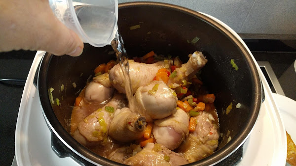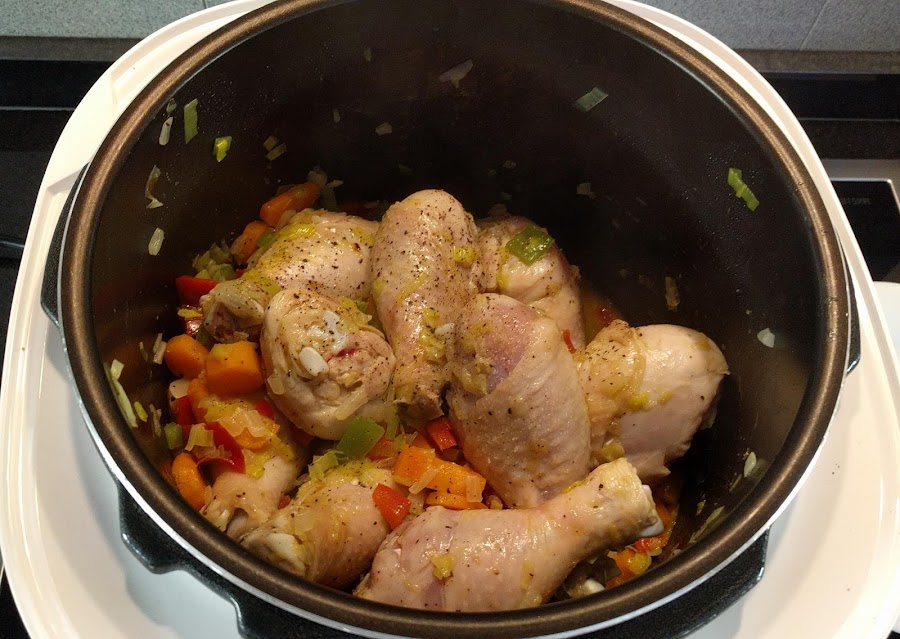 Sal y pimienta negra recién molidaSalpimentamos el pollo y reservamos. Partimos en trocitos la cebolla y en rodajas el puerro. Ponemos en la cubeta y añadimos el aceite. Programamos menú freír