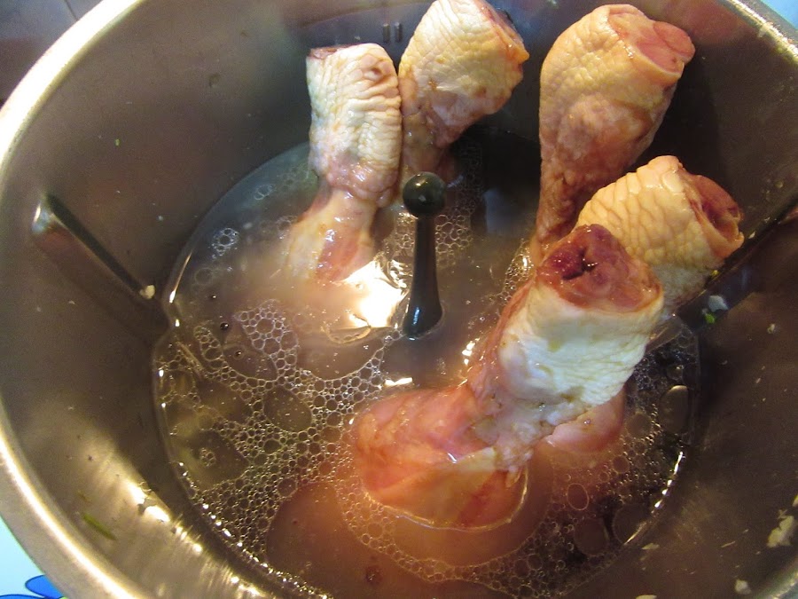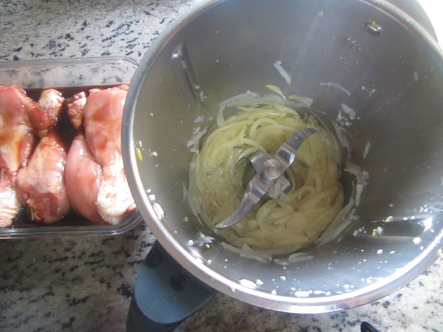 4- Colocar la mariposa y los jamoncitos, añadir la salsa de maceración, caldo de pollo, 40-45 min. Varoma, vel. cuchara, sin cubilete, colocar el cestillo en su lugar para evitar salpicaduras.