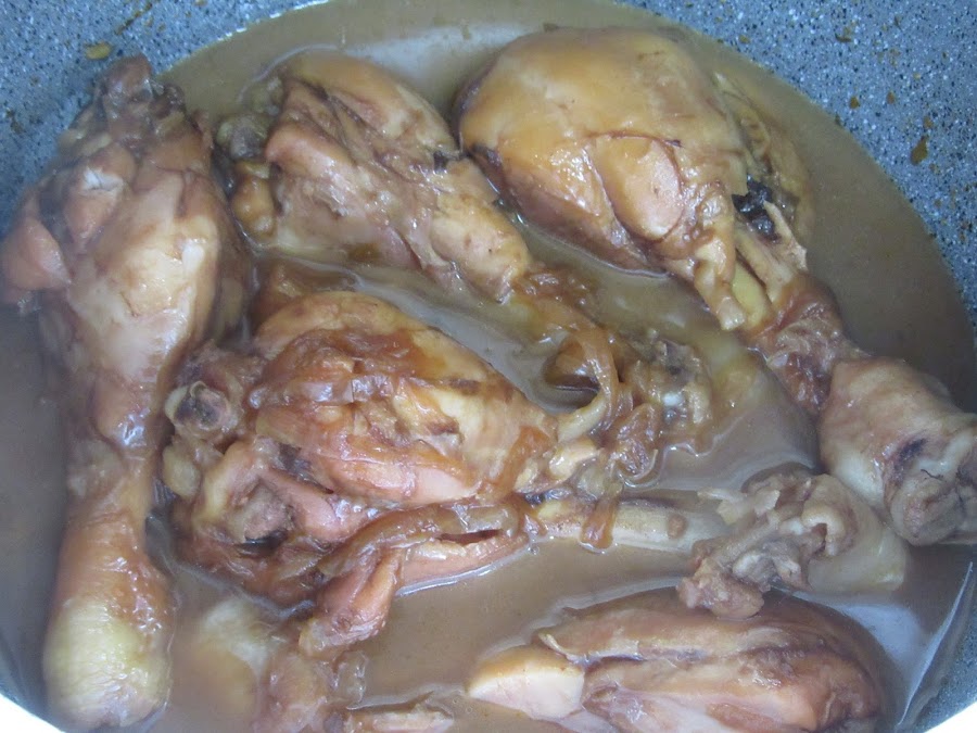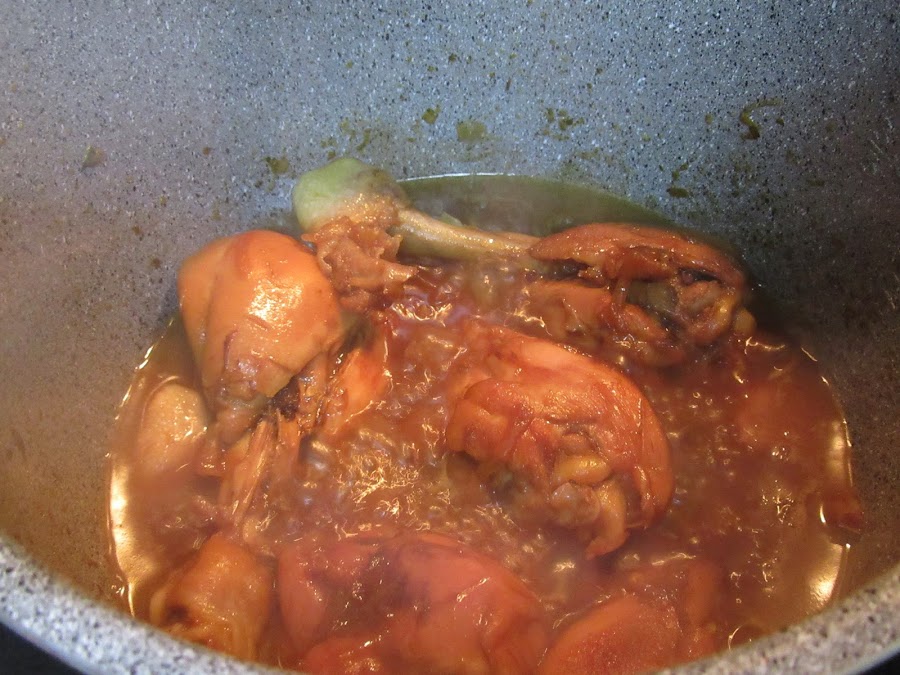 4- Añadir los jamoncitos, la salsa de maceración, caldo de pollo hasta que casi los cubra y cocer tapado unos 40 minutos.