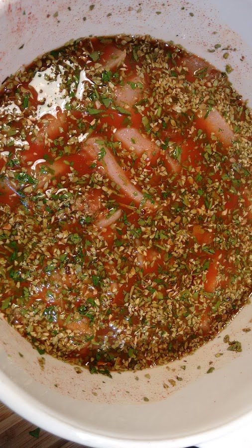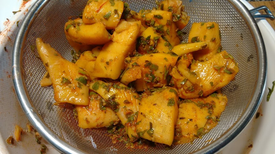 Revisar si quedan espinas, lavar, trocear y salar. Picar el perejil, ajo y la hoja de laurel. Poner en un bol la Japuta junto con todos los ingredientes y dejar macerar unas 12 h.