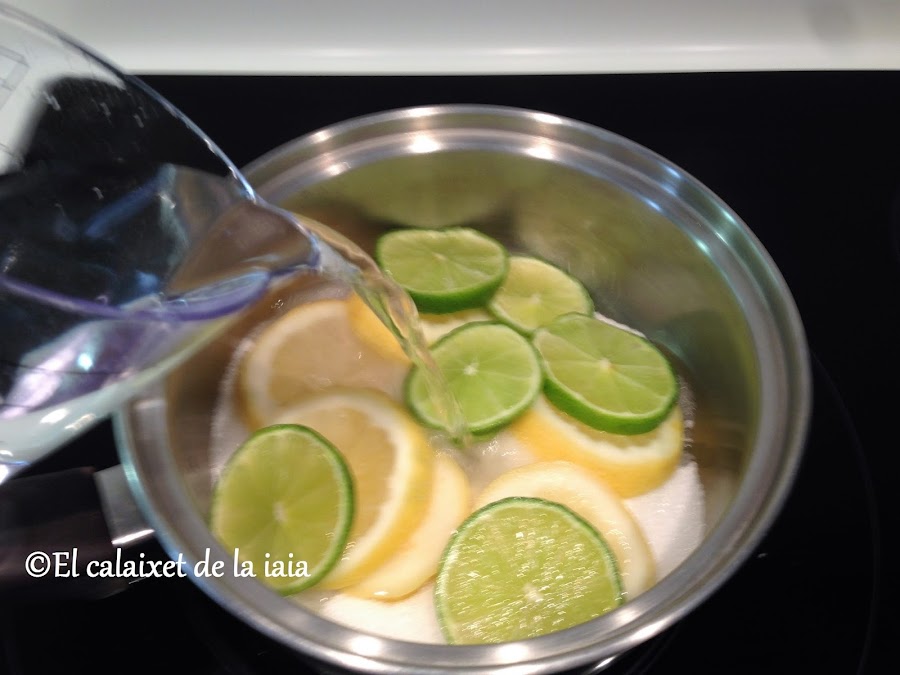 el que nos queda y la lima, lo cortaremos a rodajas, pondremos en un cazo al fuego con el azúcar y llevaremos a ebullición durante unos dos o tres minutos. Luego retiraremos los limones y la lima