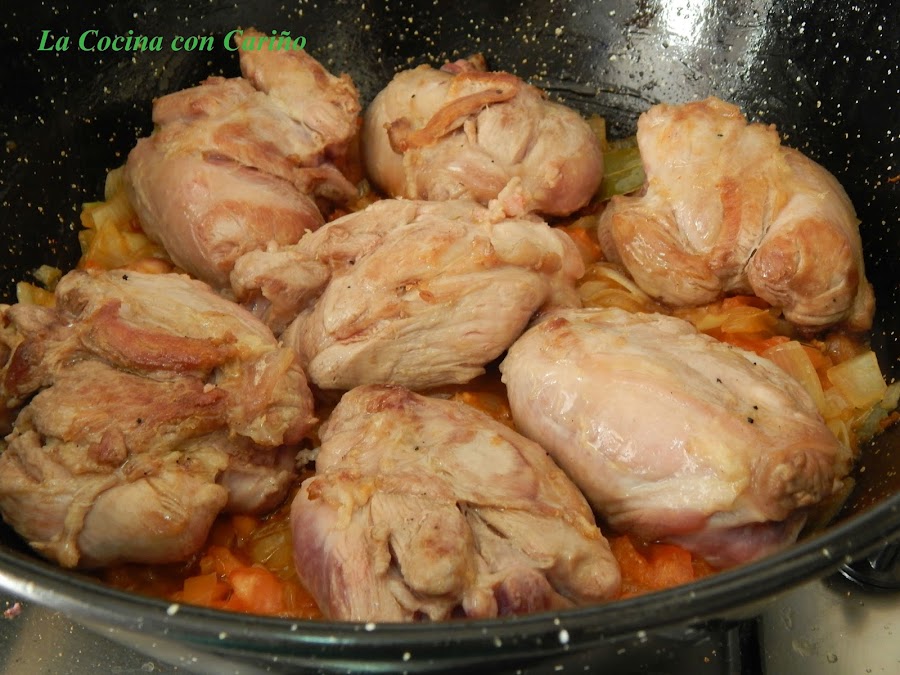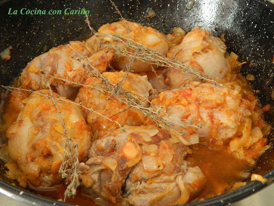 Doramos esta por un minuto, echamos el pimentón, removemos, y luego ponemos el vino. Dejamos consumir el alcohol un par de minutos, salpimentamos, echamos el tomillo y añadimos el agua. Lo vamos a cocinar hasta consumir casi todo el caldo.