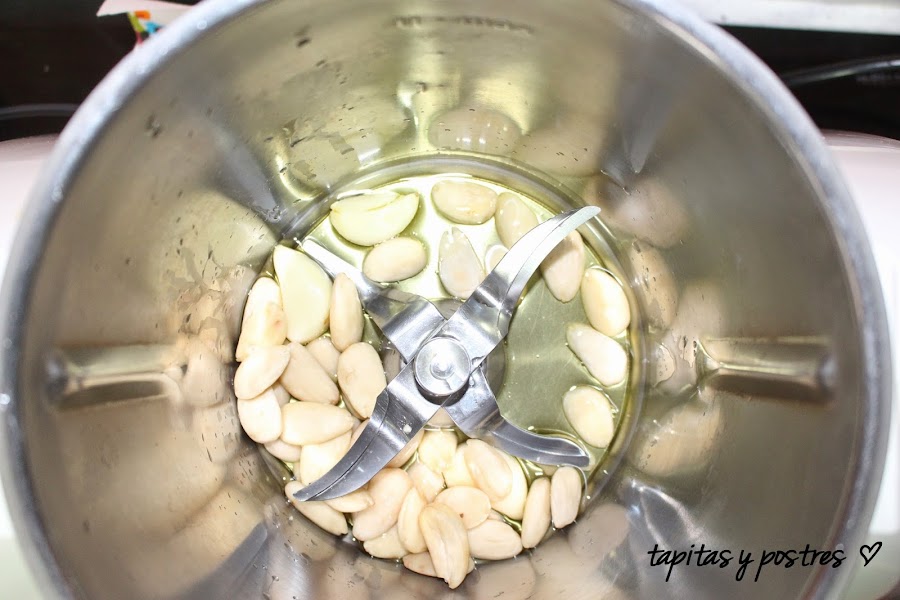 Añadir los ajos y las almendras , programar 10 minutos , temperatura Varoma , velocidad 1