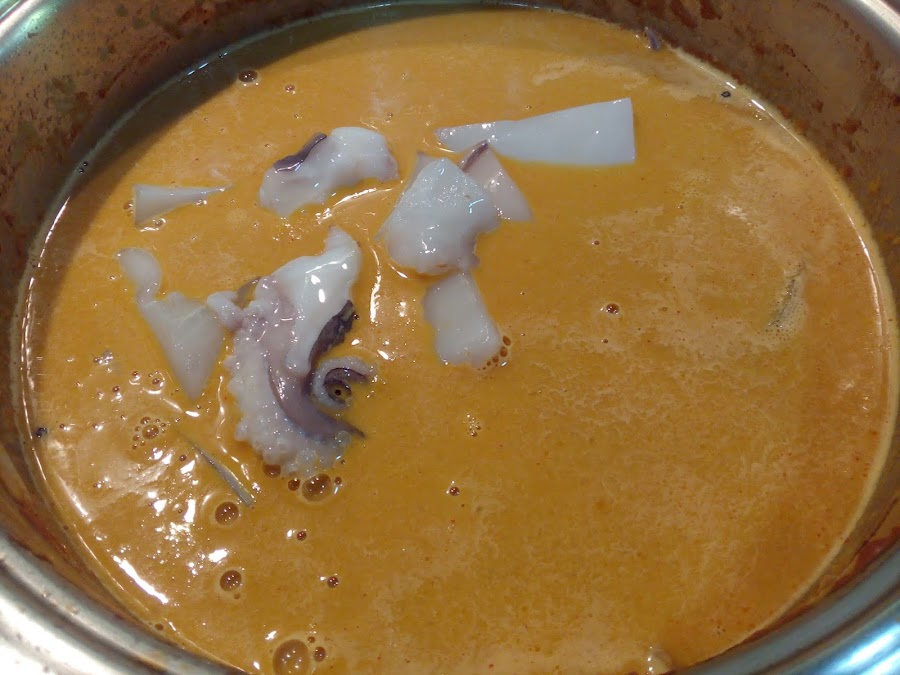 Incorporar los trozos de jibia, la pimienta en grano y las hojas de laurel. Probar de sal y rectificar si fuese necesario (hay que tener en cuenta que el bazo aporta un sabor intenso).