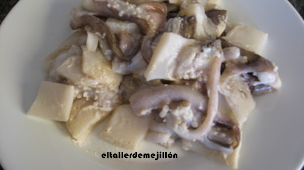 Limpiamos y cortamos la sepia en trozos, la secamos, le echamos un poco de harina y la añadimos en el aceite de oliva cuando esté bien caliente.