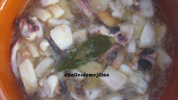 Cuando esté dorada añadimos la hoja de laurel y el vaso de vino blanco. Vamos dejando que se reduzca un poco y sacamos la sepia de la cazuela.
