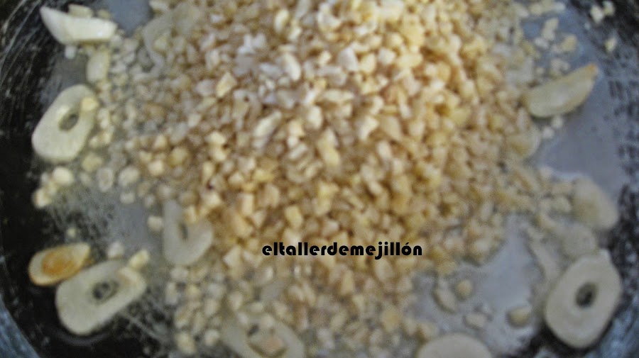 En una sartén con un chorro de aceite ponemos los dientes de ajo que hemos cortado en láminas, añadimos los 50 gramos de almendras crudas picadas y la rebanada de pan duro que hemos cortado.