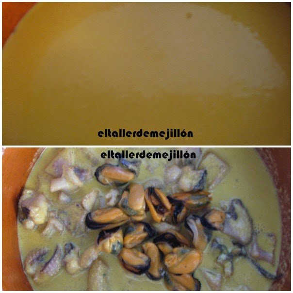 Cuando esto esté bien mezclado añadimos la salsa que nos ha quedado de freír la sepia, y añadimos un poco de agua de cocción de mejillón. Cuando tengamos todo bien ligado lo ponemos en un recipiente para pasarlo por la batidora. Nos ha quedado una salsa increíble. A mí como me gusta mucho el sabor a azafrán le he echado dos sobres.