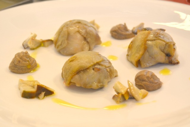 Raviolis de berenjena rellenos de gamba de Palamós y boletus confitados con puré de berenjena.