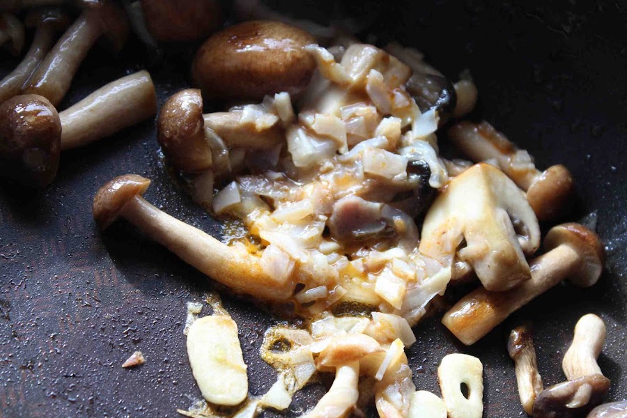 En una salteas las setas, con un poquito de ajo y aceite y en la otra, vas haciendo los huevos a la plancha.