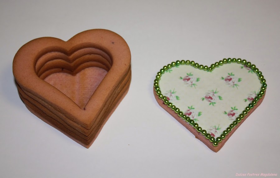 He usado glasa para pegar las piezas del joyero, y la para la tapa he usado papel de azúcar y perlas.