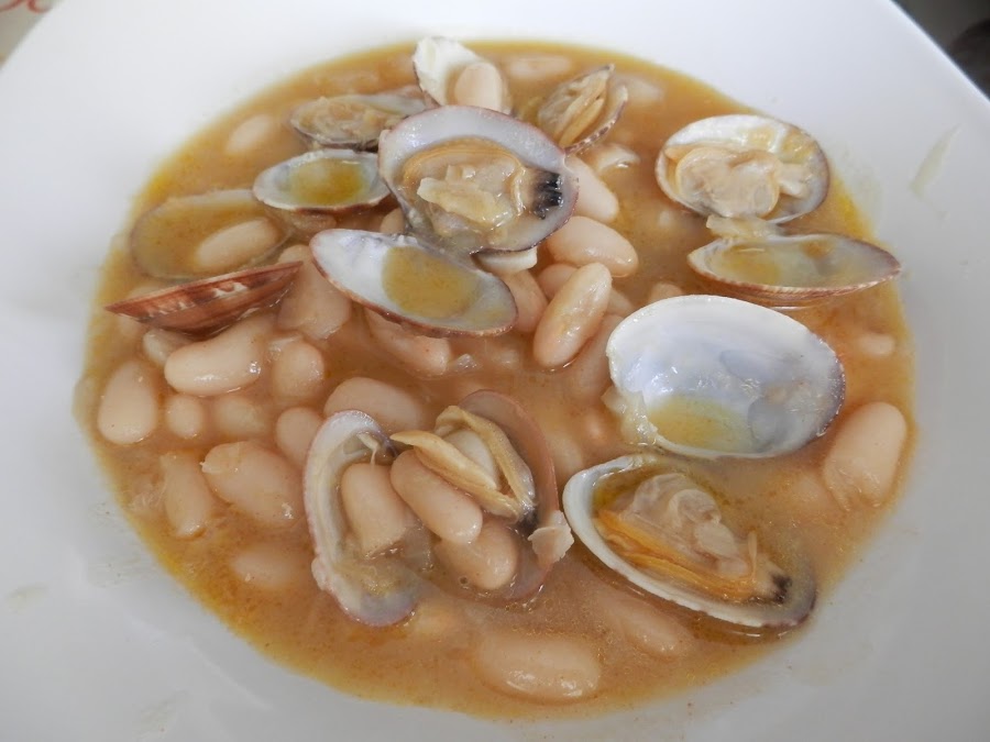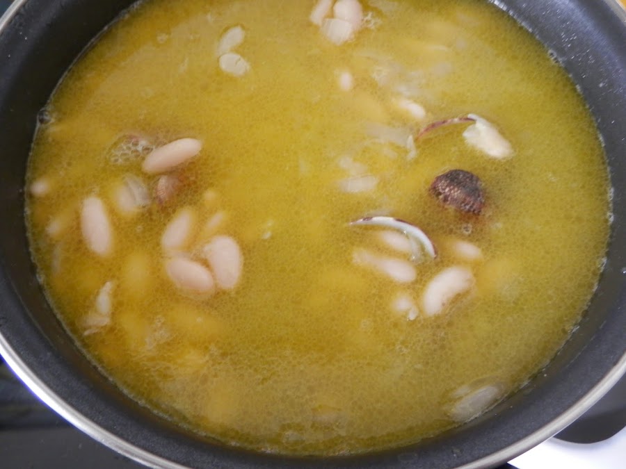 Incorporamos a la cazuela el agua de cocción de las almejas, las judías y probaremos de sal.