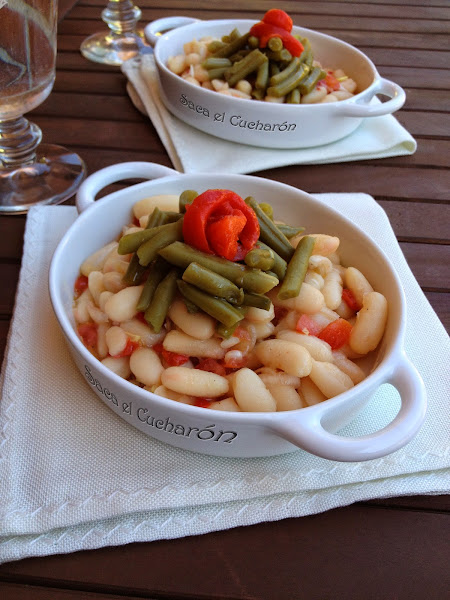Aliñamos las judías blancas con esta vinagreta y encima colocamos las judías verdes.