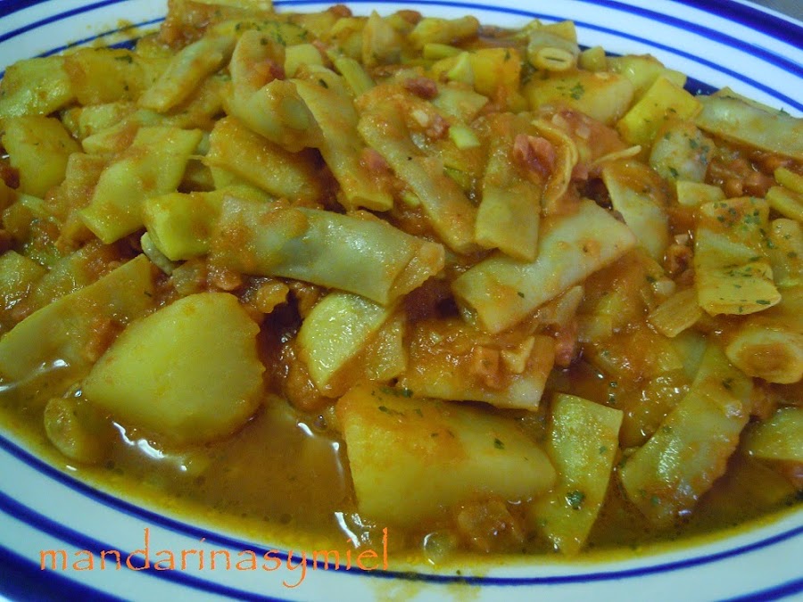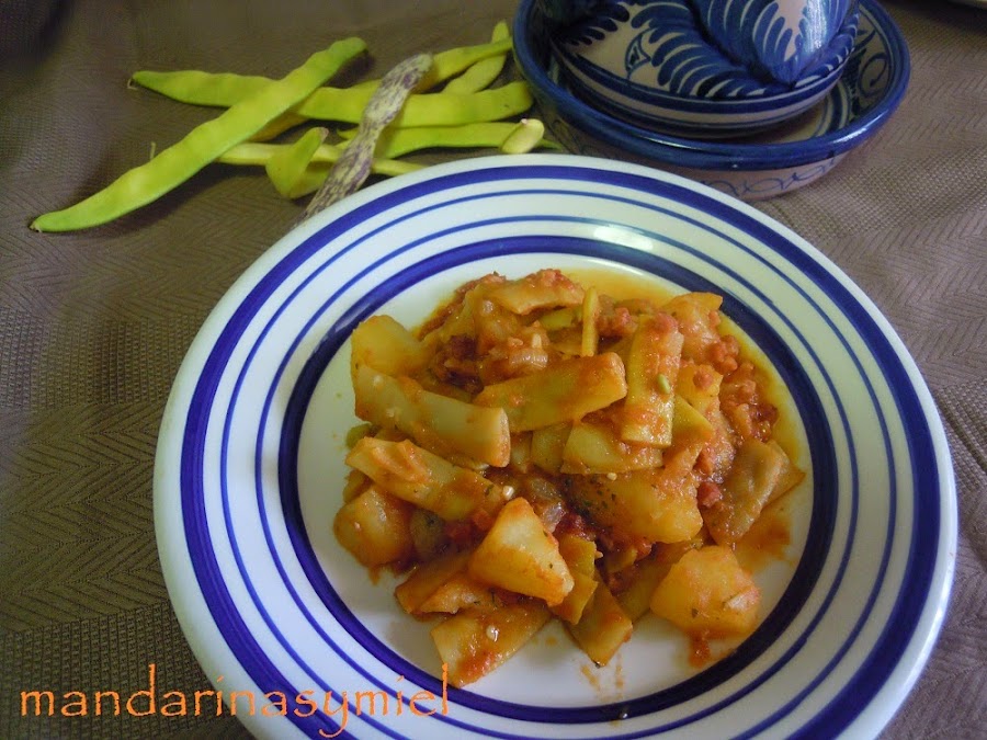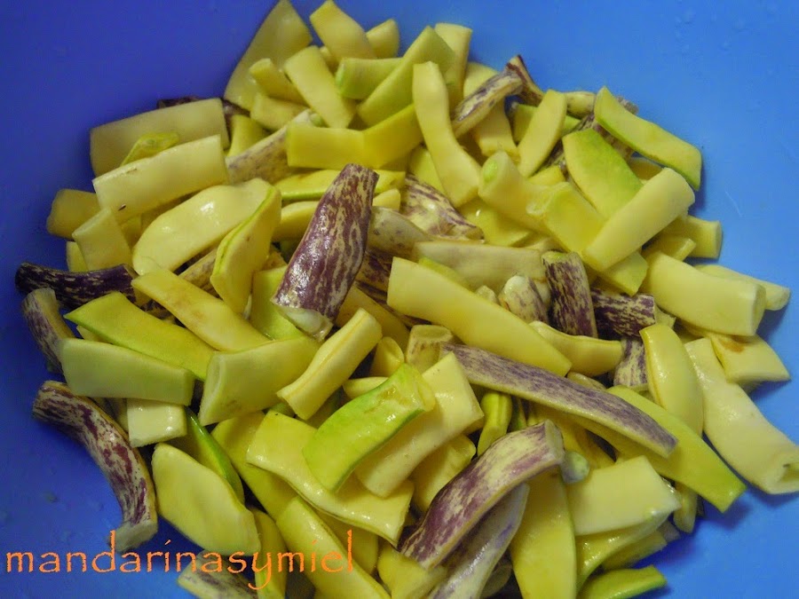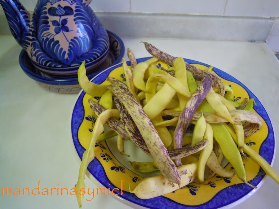 Estas judías blancas o de manteca se las regaló ayer un amigo a mi marido, he guardado unas pocas para hacer mañana la paella del domingo y el resto las he guisado. Son una variedad de las judías verdes, muy gustosas y tiernas.
