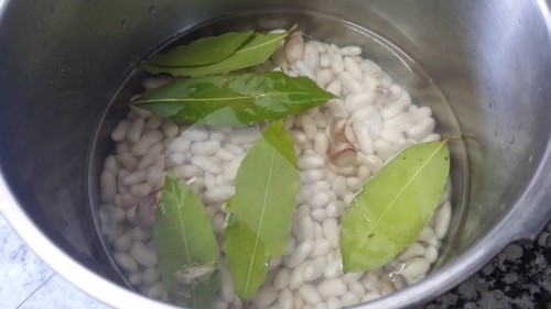Pon agua limpia en la olla rápida y agrega las alubias. Sazona, añade el laurel,