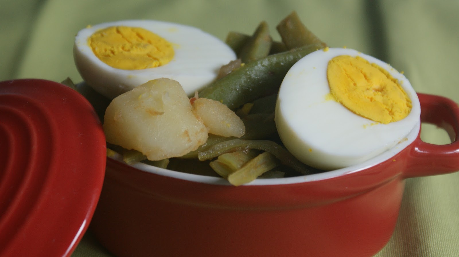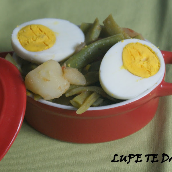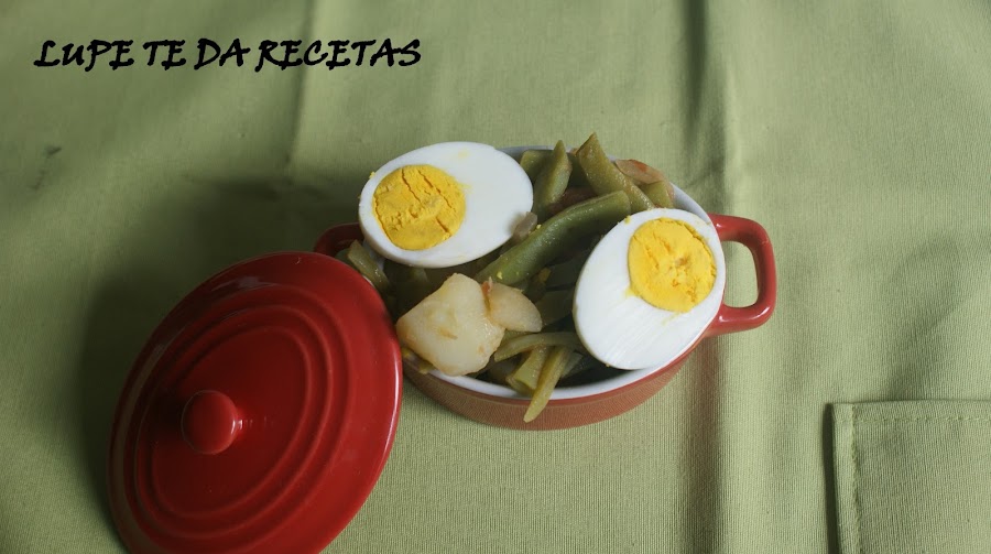 Mezclar el sofrito con las judías, las patatas. Poner los huevos encima y un chorrito de aceite virgen.