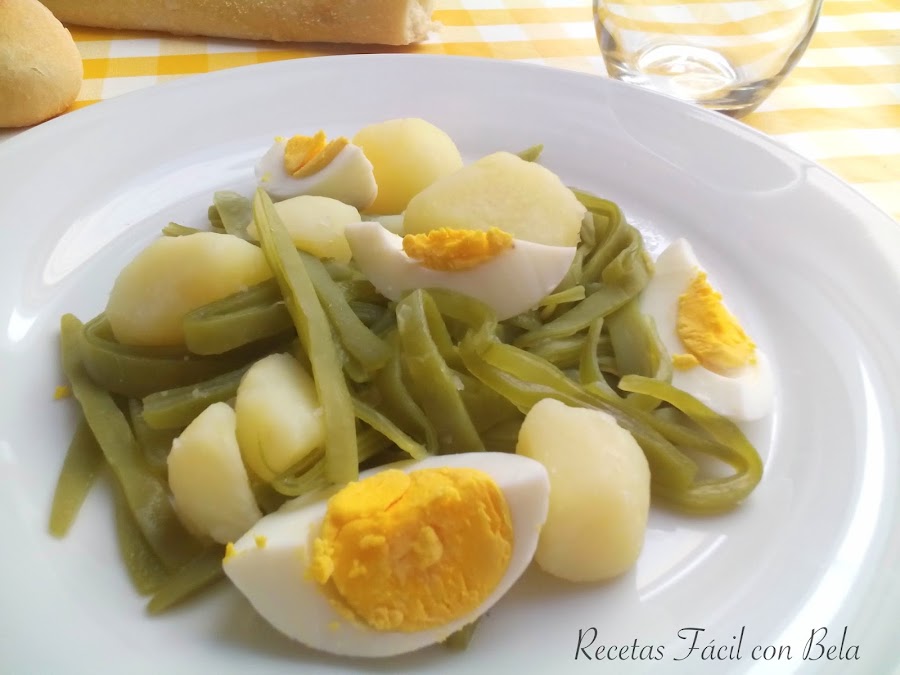 Judías con huevos y patatas aliñada con aceite y vinagre