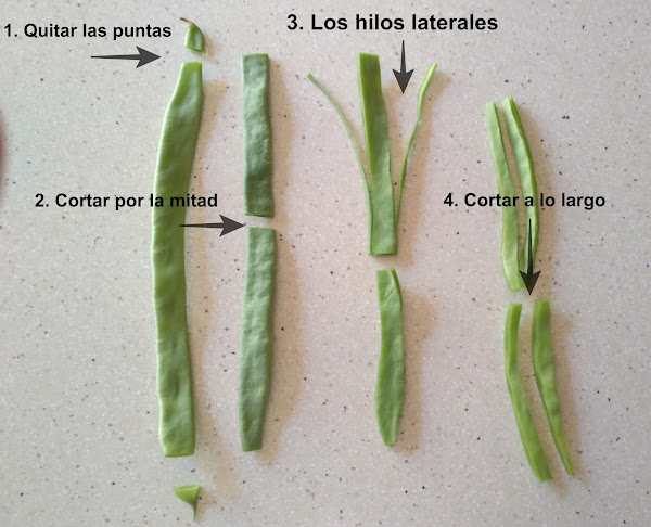 Limpiamos las judías con la ayuda de un cuchillo quitarles las puntas y los hilos laterales.