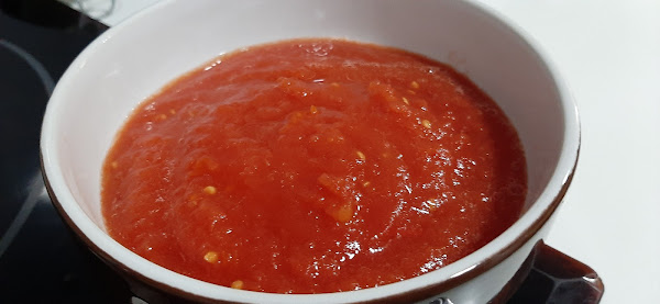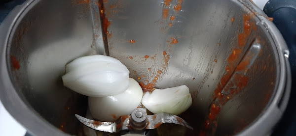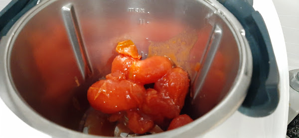 2.- En el vaso de la thermomix, ponemos los trozos de tomate escurrido y lo trituramos 5 segundos, velocidad 5 y lo reservamos en un bol.